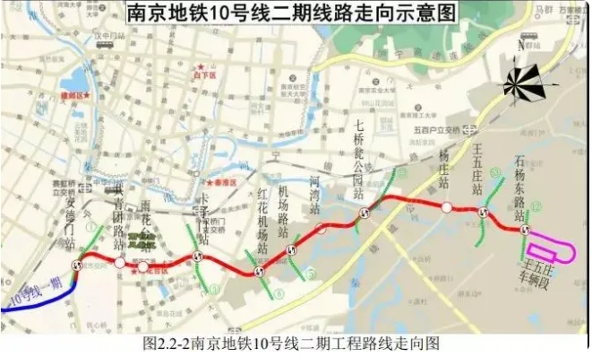 10号线二期起于安德门站(不含车站),止于石杨东路站,途经卡子门站、红花机场站。线路全长13.33公里,设10座车站。