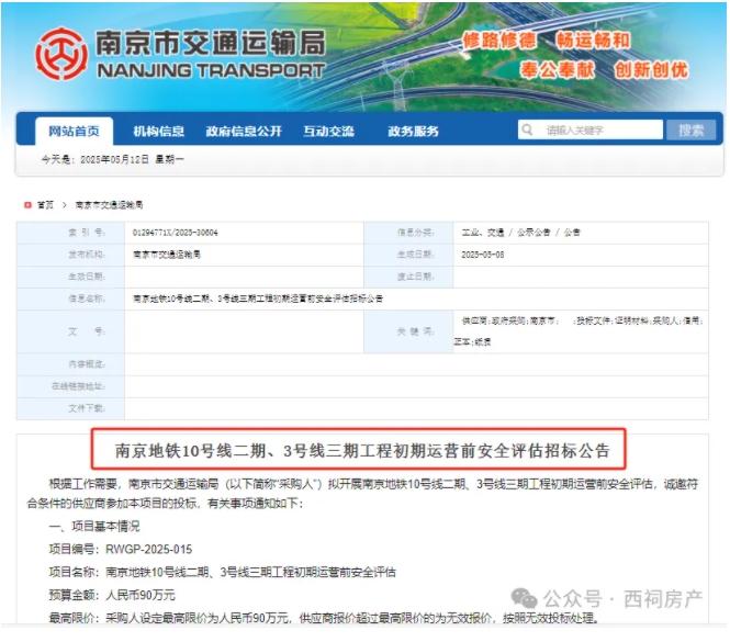 5月8日,南京市交通运输局发布了《南京地铁10号线二期、3号线三期工程初期运营前安全评估招标公告》,招标公告中提到,根据《城市轨道交通运营安全评估管理办法》(交运规〔2023〕3号)有关规定,现拟开展南京地铁10号线二期、3号线三期工程初期运营前安全评估。