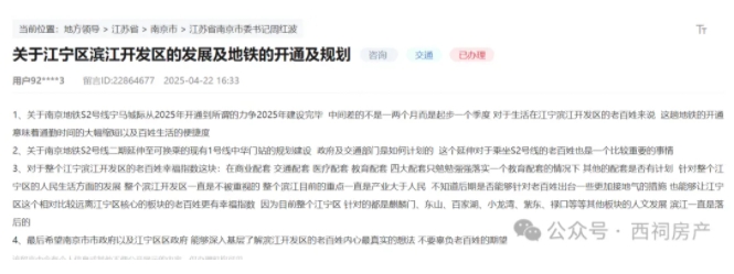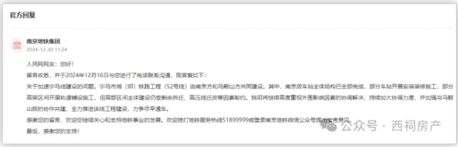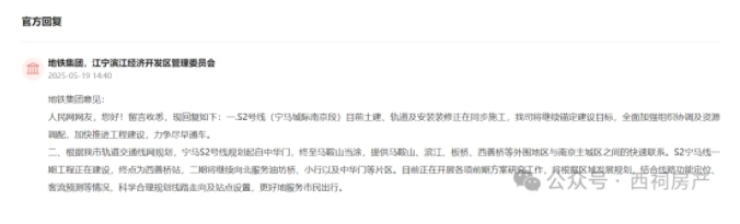 “一、S2号线(宁马城际南京段)目前土建、轨道及安装装修正在同步施工,我司将继续锚定建设目标,全面加强组织协调及资源调配,加快推进工程建设,力争尽早通车。