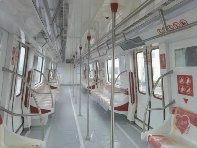 宁马城际S2线的列车已经曝光。宁马城际列车外观为枣红色,列车采用43寸LCD高清屏幕用于列车动态电子地图的显示,这也是南京地铁线路上首次在列车采用LCD显示屏。
