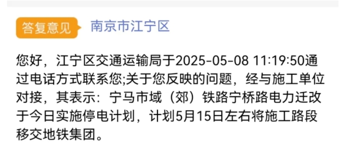 与此同时,有网友爆料:宁桥路站高压线迁改已经开始施工。江宁区运输局曾答复网友提问:宁马市域(郊)铁路宁桥路电力迁改于今日实施停电计划,计划5月15日左右将施工路段移交地铁集团。