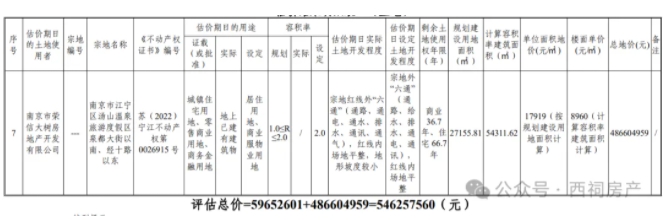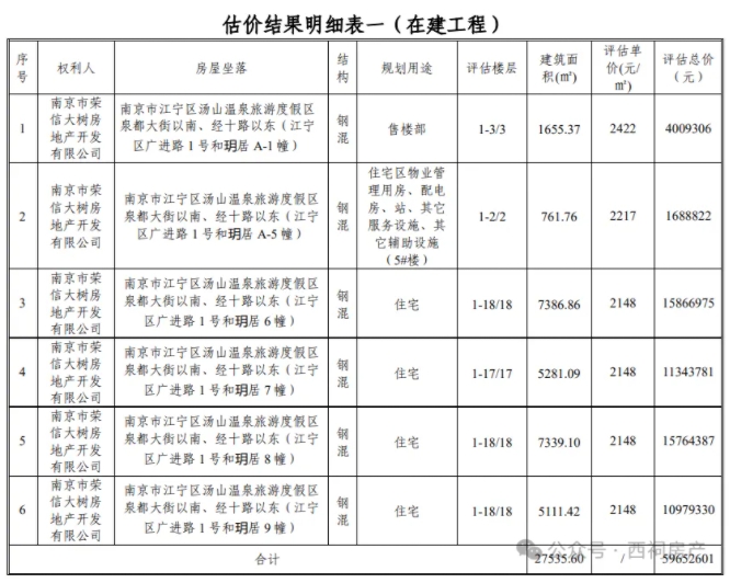 评估表显示,本次评估分为两部分,一是已建楼栋工程的评估:A-1、A-5、6、7、8、9栋,总建面约27535.60㎡,评估总价为59652601元;二是楼盘所在的土地价值,土地规划建设用地面积27155.81㎡,总地价为486604959元。