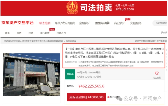 近日,据京东资产交易平台显示,南京市江宁区汤山温泉旅游度假区泉都大街以南、经十路以东的一宗宗地商住用地土地使用权、地上在建工程(江宁区广进路1号和玥居A-1幢、A-5幢、6幢、7幢、8幢、9幢)及地下室等相关附属设施即城东楼盘嘉福金粼被整体拍卖,拍卖时间为2025年6月20日10时至2025年6月21日10时止。