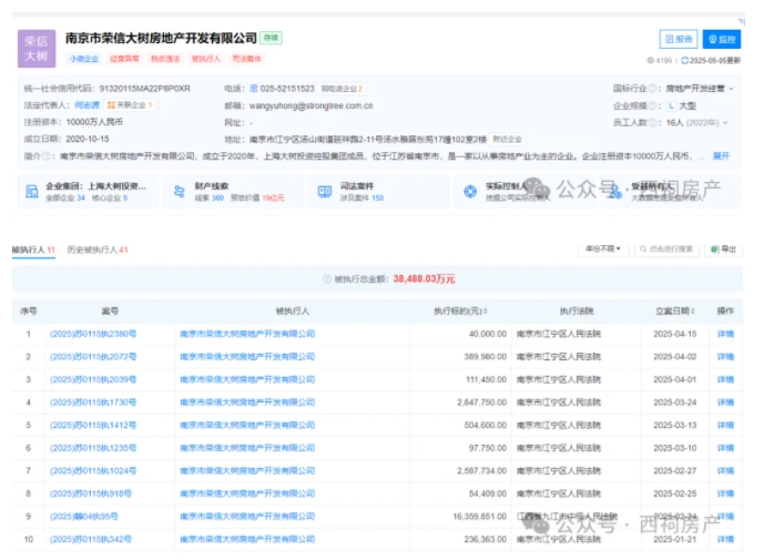 天眼查显示,南京市荣信大树房地产开发有限公司已经营异常,存在欠税情况,被列为被执行人,被执行总金额为38488.03万元。