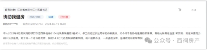 2024年6月,项目并未如约复工,有G104地块业主留言官方,请求退房。江宁经济技术开发区作出回复:“因项目总包方苏中建设公司内部资金链断裂,导致项目长期停工,不能完成交付。开发商表示只退房款,无按揭贷款利息补偿,目前已有大部分业主与开发商签订相关协议。”据悉,当时珠江四季悦城G98地块购房业主此前已经全部退款,G104地块的业主们也在陆续办理了退房事宜。