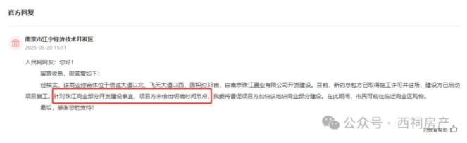 针对项目商业部分的进展,2024年11月21日,南京经济技术开发区管理委员会回复:“招商部门正在利用现有载体空间积极对接优质的商业资源,争取尽快在片区商业导入方面取得突破。五矿商业综合体因受市场环境和资金筹集等原因,项目进展缓慢。”