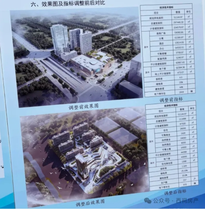 调整后:规划建筑面积111898㎡,其中住宅为26000㎡,可售商业为1500㎡,自持商业为24000㎡,自持酒店为6000㎡,可售公寓为10000㎡。