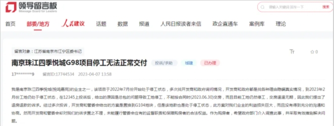 近日,又有网友在人民网领导留言板上咨询禄口珠江四季悦城商业何时能复工?2025年5月20日,南京市江宁经济技术开发区表示:“该商业综合体位于信诚大道以北、飞天大道以西,面积约38亩,由南京珠江置业有限公司开发建设。目前,新的总包方已取得施工许可并进场,建设方已启动项目复工。针对珠江商业部分开发建设事宜,项目方未给出明确时间节点,我委将督促项目方加快该地块商业部分建设。”