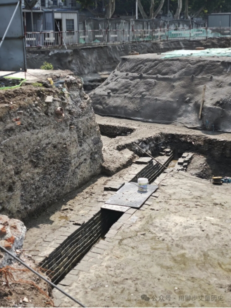 微信公号“用脚步丈量历史”消息显示,在现场实探中,还发现了一段保存完整的南唐时期排水渠遗址,在其南侧还有疑似龙光门城墙的基础遗址。