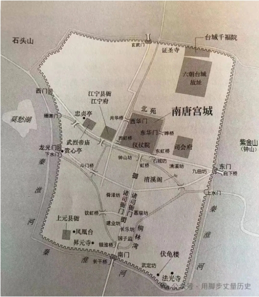 当然,通过对都城格局与水系的重构,南唐为南京奠定了山水城林融为一体的空间基础,突破了六朝建康“因形就势”的不规则形态,首次构建出规整的方形都城框架。当时的南唐金陵新城,周长达到12公里半,“西据石城,南接长干,东连白下桥(即今大中桥),北限玄武桥。”