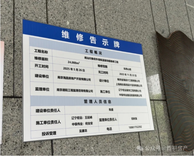 今日(5月28日),西祠房产实探中海南山印发现,该小区外墙保温装饰板维修工程维修告示牌已经上墙。维修告示牌显示,本次维修面积为24000㎡,维修范围为东西山墙。开工日期为2025年5月26日,完工日期为2025年11月22日。