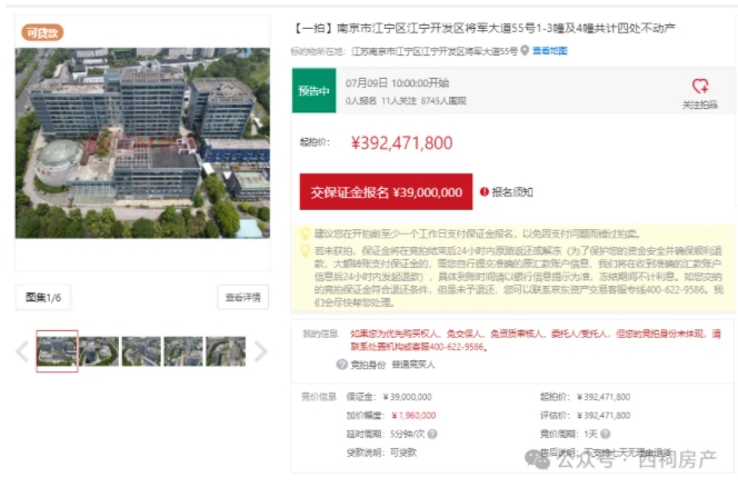 近日,南京市江宁区江宁开发区将军大道55号1-3幢及4幢共计四处不动产即原钱包大厦上架司法拍卖,起拍价格为39247.18万元,评估价格为39247.18万元,保证金为3900万元,加价幅度为196万元,江苏省南京市中级人民法院将于2025年7月9日10时至2025年7月10日10时止进行公开拍卖活动,处置机构为南京市中级人民法院。