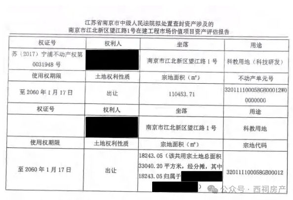 据评估报告介绍,目前,江北新区望江路1号31549.1平方米房屋及分摊的14797.15土地已过户给其他公司,地下10978平方米共计203个停车位已被其他法院处置,均不纳入本次拍卖范围。