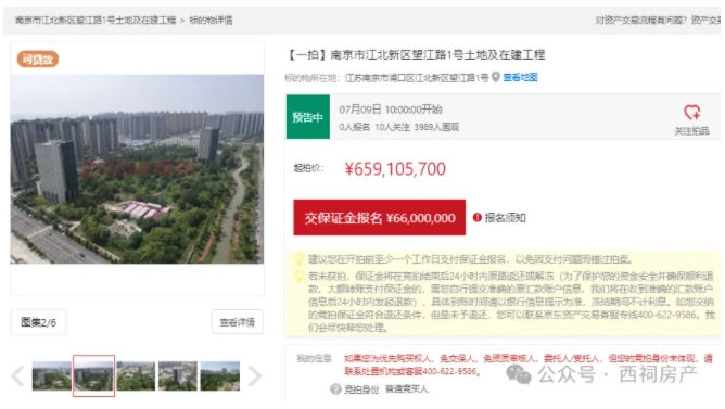 近日,南京市江北新区望江路1号土地及在建工程即福中智慧城上架司法拍卖,项目起拍价格为65910.57万元,评估价格为65910.57万元,保证金为6600万元,加价幅度为329万元,本次拍卖时间为2025年7月9日10时至2025年7月10日10时止,处置机构为南京市中级人民法院。