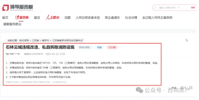 近日,有网友在人民网领导留言板上反映,位于城南板桥的大盘石林云城涉嫌违规改造、私自拆除消防设施。这位网友表示:板桥A地块南区2、4号楼涉嫌违规占用夹层储藏室、私自拆除夹层所有消防管道、设施等,6号楼涉嫌违规在架空层增设结构板等。
