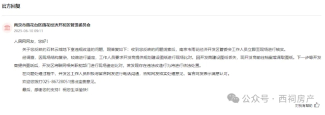 6月10日,南京市雨花台区雨花经济开发区管理委员会回复:“经调查,因现场结构复杂,较难进行鉴定,工作人员要求开发商提供规划建设图纸进行现场比对。因开发商建设图纸丢失,现开发商前往档案馆调取图纸。下一步等开发商提供图纸后,开发区将联同相关职能部门进行现场鉴定比对,若发现存在违法改造行为将进行依法处置。”
