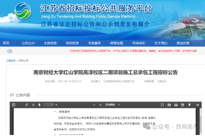 公告显示,南京财经大学红山学院高淳校区二期项目施工总承包工程位于江苏省南京市高淳区鹿鸣大道66号,投标报名截止日期为2025年9月。