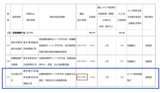 2016年,中冶和记洋行作为下关滨风光带的重点改造区域进行改造;2017年被列入“江苏省重大工程”,正式开工。当时据“中冶盛世滨江”消息,项目总投资约28.5亿元,已有高端影院品牌-韩国CGV影院、上海威尔士健身机构等10余个商家签约入驻。
