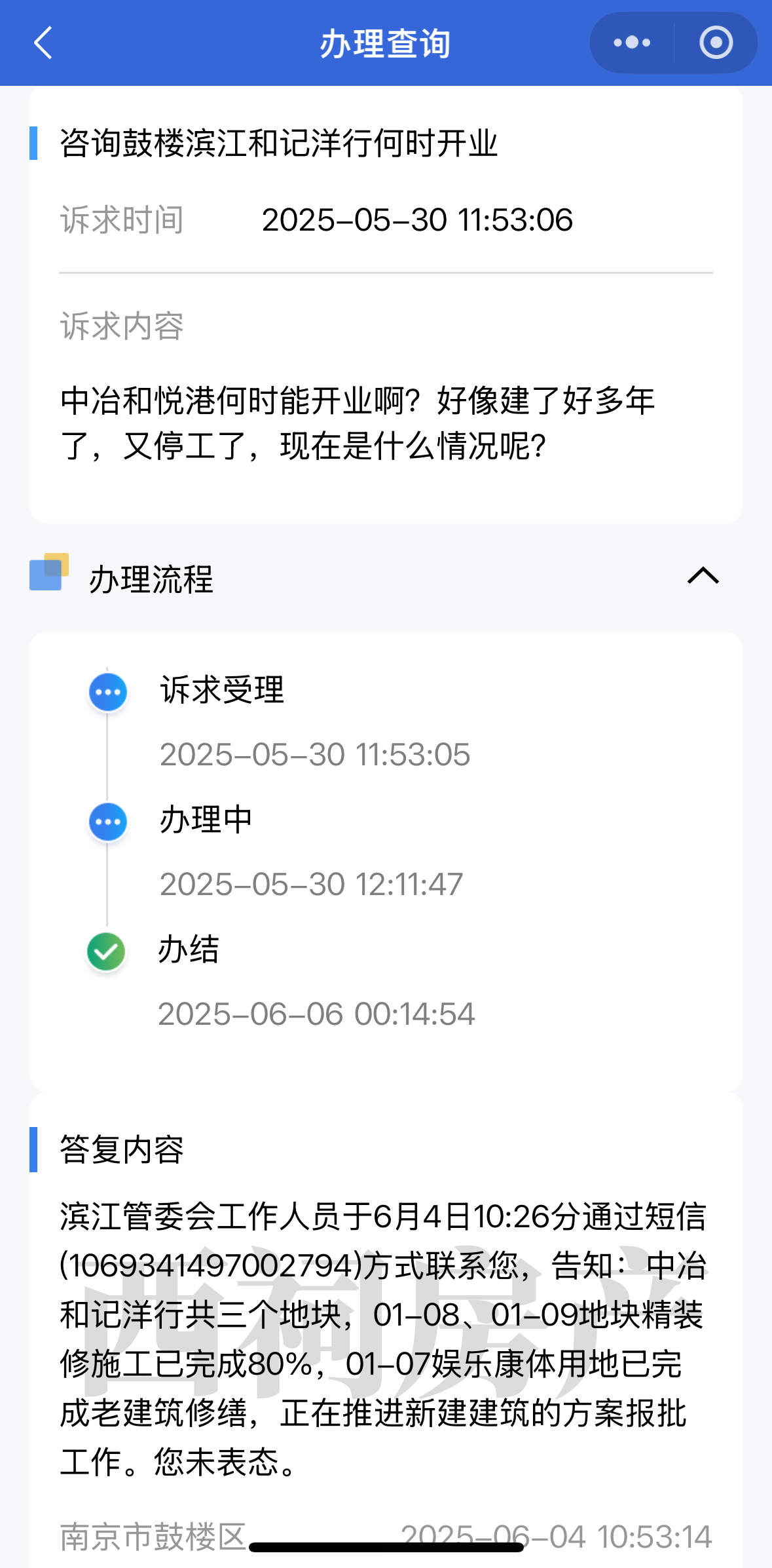 6月4日,鼓楼滨江管委会工作人员回复:“中冶和记洋行共三个地块,01-08、01-09地块精装修施工已完成80%,01-07娱乐康体用地已完成老建筑修缮,正在推进新建建筑的方案报批工作。”
