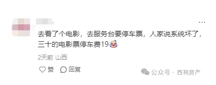 “去看了个电影,去服务台要停车票,人家说系统坏了三十的电影票停车费19。”