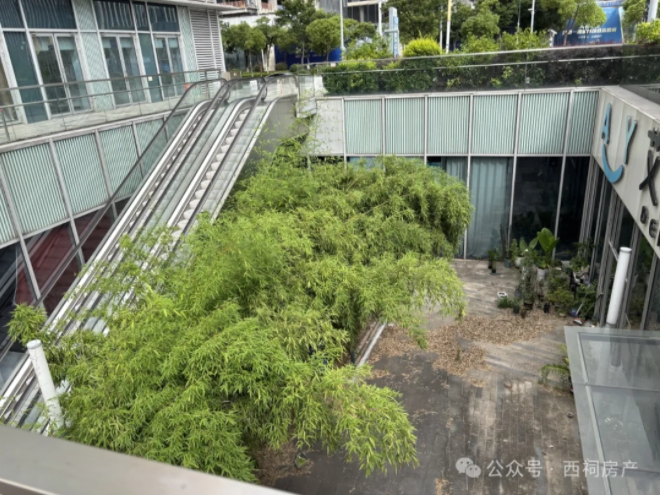 商场看起来疏于维护,通往下沉广场的电梯已经关闭,落叶也无人清扫。