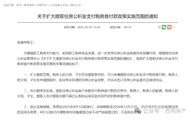 5月7日,江苏省直公积金发布《关于扩大提取住房公积金支付购房首付款政策实施范围的通知》。