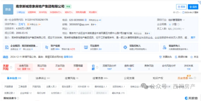 天眼查显示,南京新城意象房地产集团有限公司创立于2006年,实控人为王鸿飞,目前已被列为被执行人,被限制高消费,涉案金额超6亿元。