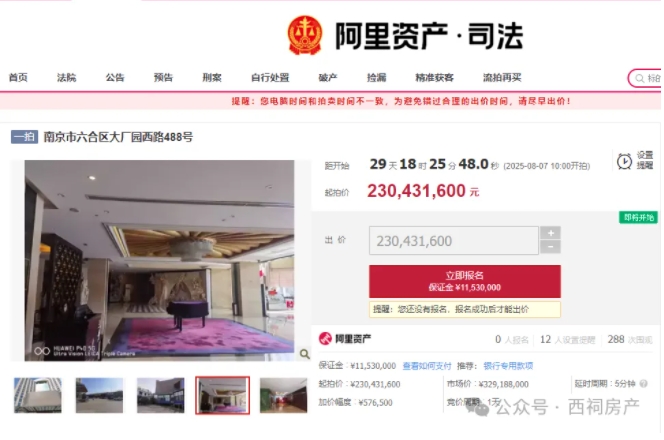 近日,南京市六合区大厂园西路488号即金陵新城饭店被放上法拍架,酒店起拍价为23043.16万元,评估价格为32918.8万元,相当于打了7折,加价幅度为57.65万元,参拍需要缴纳保证金1153万元,拍卖时间为2025年8月7日10时至2025年8月8日10时止。截至发稿前,本次拍卖有300多次围观,14人设置提醒,尚无人报名。