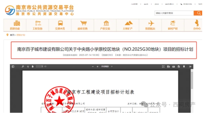 7月14日,据南京市公共资源交易中心显示,南京百子城市建设有限公司关于中央路小学原校区地块(NO.2025G30地块)项目招标计划发布。