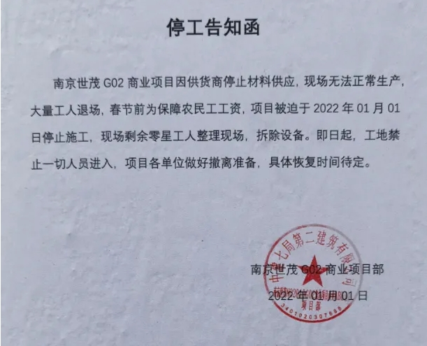 然而随着世茂的暴雷,2022年世茂璀璨睿湾的商业项目部也发布一纸告知函,称“因供货商停止材料供应,现场无法正常生产、大量工人退场,G02工地被迫停工,恢复时间待定。”