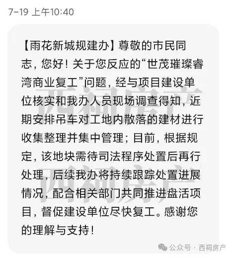 7月19日,雨花新城规建办回复:“经与项目建设单位核实和我办人员现场调查得知,近期安排吊车对工地内散落的建材进行收集整理并集中管理;目前,根据规定,该地块需待司法程序处置后再行处理,后续我办将持续跟踪处置进展情况,配合相关部门共同推进盘活项目,督促建设单位尽快复工。”
