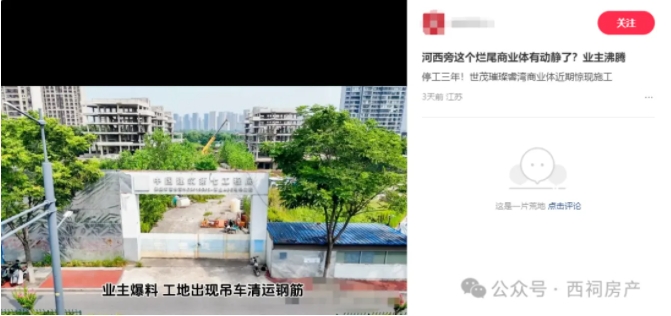 近日,有网友爆料:世茂璀璨睿湾商业有吊车正在清运生锈钢筋,疑似复工。