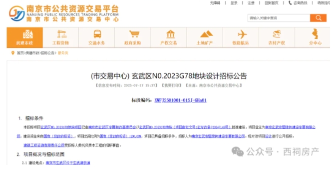 7月17日,据南京市公共资源交易平台显示,玄武区NO.2023G78地块设计招标公告发布。