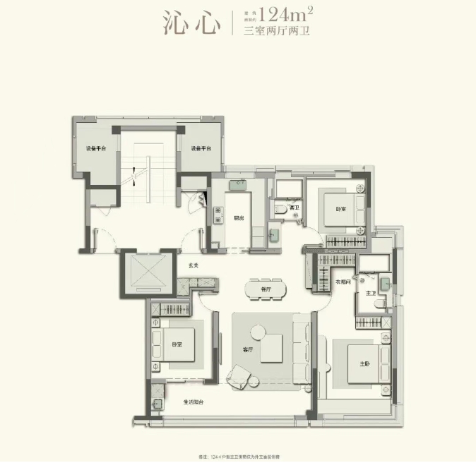 建面约124㎡三房两厅两卫三开间朝南,双卧朝南+约7.7米开间的双联落地窗阳台+主卧套房,3个卧室在不同方向,互不打扰隐私感更强,几乎没什么过道面积浪费。尤其是主卧,套间设计且大尺度,270°转角飘窗、有单独的衣帽间空间。