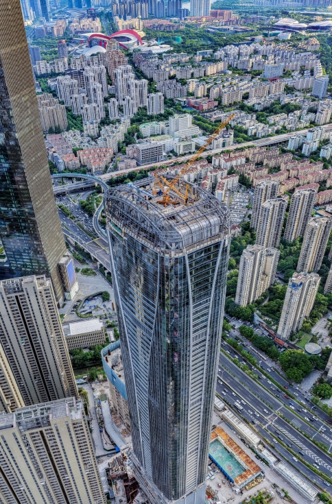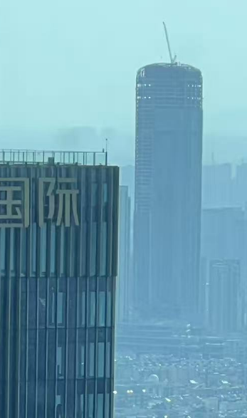 塔楼南侧,正对金鹰世界方向的玻璃幕墙也在快速安装中。笔者现场目测,现场已突破60层大关,正在向65层的天际高度发起最后冲击。