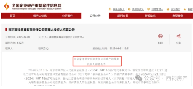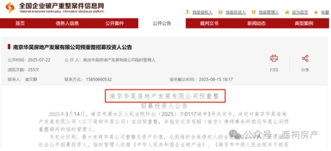 同样位于南京都市圈的南京华昊房地产发展有限公司(以下简称“华昊公司”)也在招募投资人。7月22日,为充分识别、最大发挥华昊公司重整及资产价值,从而维护全体债权人的合法权益,华昊公司现面向社会公开招募投资人。