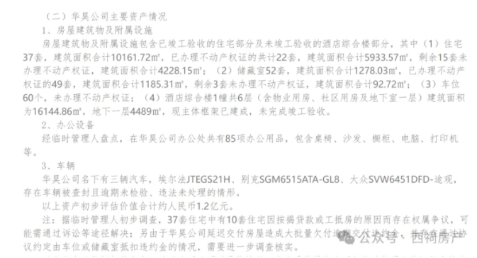目前,华昊公司主要资产包含住宅、酒店综合楼部分、办公设备以及3辆汽车,估值约1.2亿元,值得一提的是,其中37套住宅有10套住宅因按揭贷款或工抵房的原因而存在权属争议,可能需通过诉讼等途径解决。