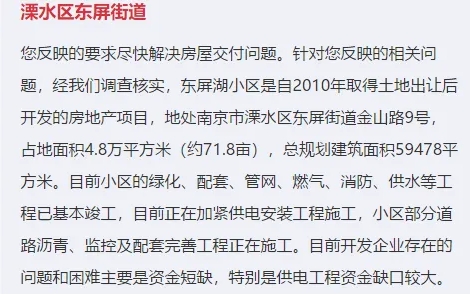 据公开报道显示,此前,该小区因资金短缺,工程进展缓慢甚至陷入停工纠纷,曾多次延期交付,部分业主的房屋延期交付长达6年之久,被网友戏称为“南京延期交付时间最长的楼盘”。