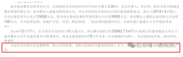 公告显示,万悦城因开发过程中资金链断裂,陷入经营困难,导致万悦城项目建设陆续停工至今,已全面停止开发建设销售等经营活动。2024年5月,南京市高淳区人民法院裁定受理中景建业(北京)建设工程有限公司对南京豪泽置业有限责任公司的破产清算申请。