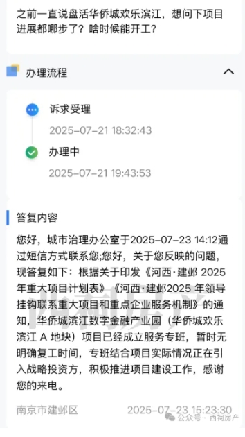 7月23日,官方回复:“根据关于印发《河西·建邺 2025年重大项目计划表》《河西·建邺2025 年领导挂钩联系重大项目和重点企业服务机制》的通知,华侨城滨江数字金融产业园(华侨城欢乐滨江A 地块)项目已经成立服务专班,暂时无明确复工时间,专班结合项目实际情况正在引入战略投资方,积极推进项目建设工作。”