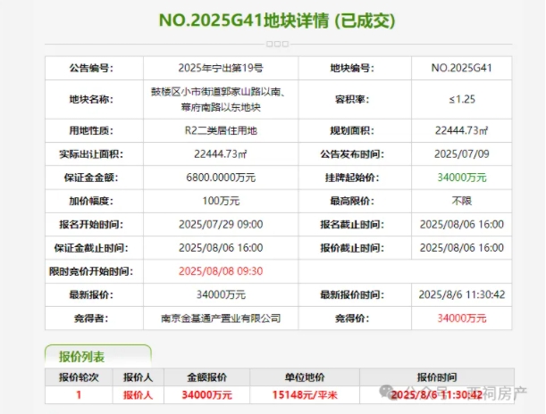鼓楼G41地块,底价成交,拿地房企为金基,成交总价3.4亿元,成交楼面价12119元/㎡。