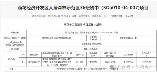 8月7日,雨花经济开发区人居森林示范区36班初中(SOa010-04-007)项目发布了渣土运输处置招标计划表,预计9月开始招标!