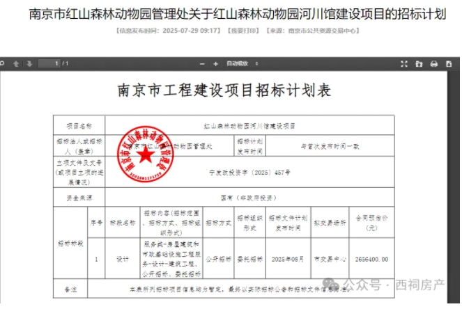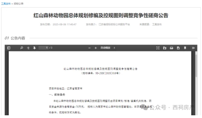 8月6日,“红山森林动物园总体规划修编及控规图则调整竞争性磋商公告”发布,招标人为南京市红山森林动物园管理处。公告显示,红山森林动物园总体规划修编及控规图则调整已由项目审批/核准/备案机关批准,资金来源为自筹资金:70万元。