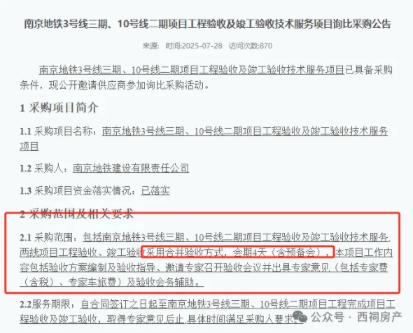 近日,《南京地铁3号线三期、10号线二期项目工程验收及竣工验收技术服务项目询比采购公告》发布,意味着这两条地铁的工程竣工验收工作即将启动。文件显示,这两条地铁项目工程验收、竣工验收采用合并验收方式,距离这两条地铁正式开通又近一步。