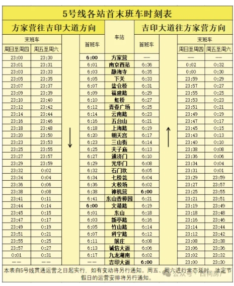 5号线全线工作日早晚高峰采用大、小交路组织行车,大交路为吉印大道——方家营,小交路为科宁路——方家营;其他时段及周末采用吉印大道——方家营单一交路运行。吉印大道往方家营方向于吉印大道站和神机营站设首班车,方家营往吉印大道方向于方家营站和文靖路站设首班车,首班车发车时间维持6:00不变;周日至周四两端末班车发车时间为23:00,周五至周六组织常态化延时,两端末班车发车时间为23:30。
