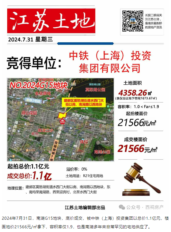 2024年7月31日,南湖G15地块,底价成交,被中铁(上海)投资集团以总价1.1亿元,楼面地价21566元/㎡拿下,容积率仅1.9,也是南湖多年来非常罕见的宅地供应了。