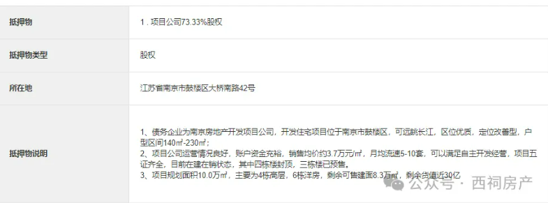 1、债务企业为南京房地产开发项目公司,开发住宅项目位于南京市鼓楼区,可远眺长江,区位优质,定位改善型,户型区间140㎡-230㎡;