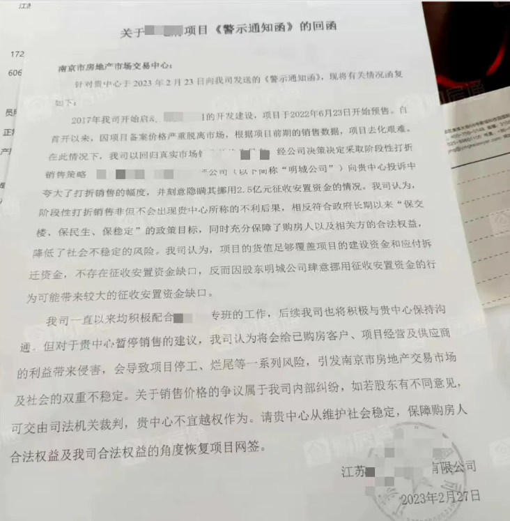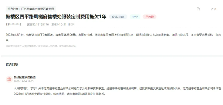 在此期间,该楼盘还因拖欠服装定制费用被投诉。当时,官方表示:经建宁路街道司法所调解,已就货款拖欠事宜达成调解协议书,江苏建宁府置业有限公司承诺在2023年11月底前全额支付货款。