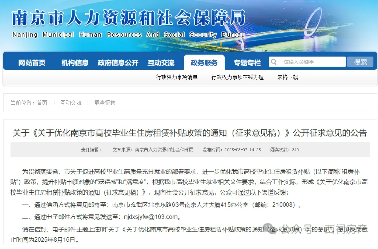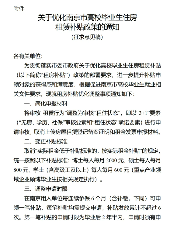 8月7日,“关于《关于优化南京市高校毕业生住房租赁补贴政策的通知(征求意见稿)》公开征求意见的公告”发布。本次调整为贯彻落实省、市关于促进高校毕业生高质量充分就业的部署要求,进一步优化我市高校毕业生住房租赁补贴政策,提升补贴申领对象的“获得感”和“满意度”,根据南京市高校毕业生就业相关文件要求,结合工作实际,形成《关于优化南京市高校毕业生住房租赁补贴政策的通知(征求意见稿)》。
