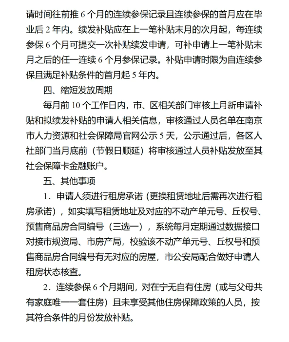在南京用人单位每连续参保6个月(含补缴)可申领一笔补贴,每笔补贴均需提交申请,补贴发放累计不超过6次。第一笔补贴的申请时限为毕业后2年半内,申请时须有申请时间往前推6个月的连续参保记录且连续参保的首月应在毕业后2年内。续发补贴应在上一笔补贴末月的次月起,每连续参保6个月可提交一次补贴续发申请,可补申请上一笔补贴末月之后的任一连续6个月参保记录。补贴申请时限为自连续参保且满足补贴条件的首月起5年内。